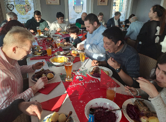 Unsere Feier startete um 11:00. Zu Beginn gedachten wir mit einer Gedenkminute unseres langjährigen Mitgliedes Egbert Hermanski und würdigten damit seine verdienstvolle Mitgliedschaft. Danach skizzierte unser Vorsitzender Marc Seefeld vor allem die sportliche Lage unseres Vereins und gab dabei der Hoffnung statt, dass die erste Mannschaft wieder in die erste Klasse aufsteigt. Zum Schluss wünschte er noch allen eine fröhliche, gesunde Weihnachtsfeier und einen guten Rutsch ins neue Jahr.